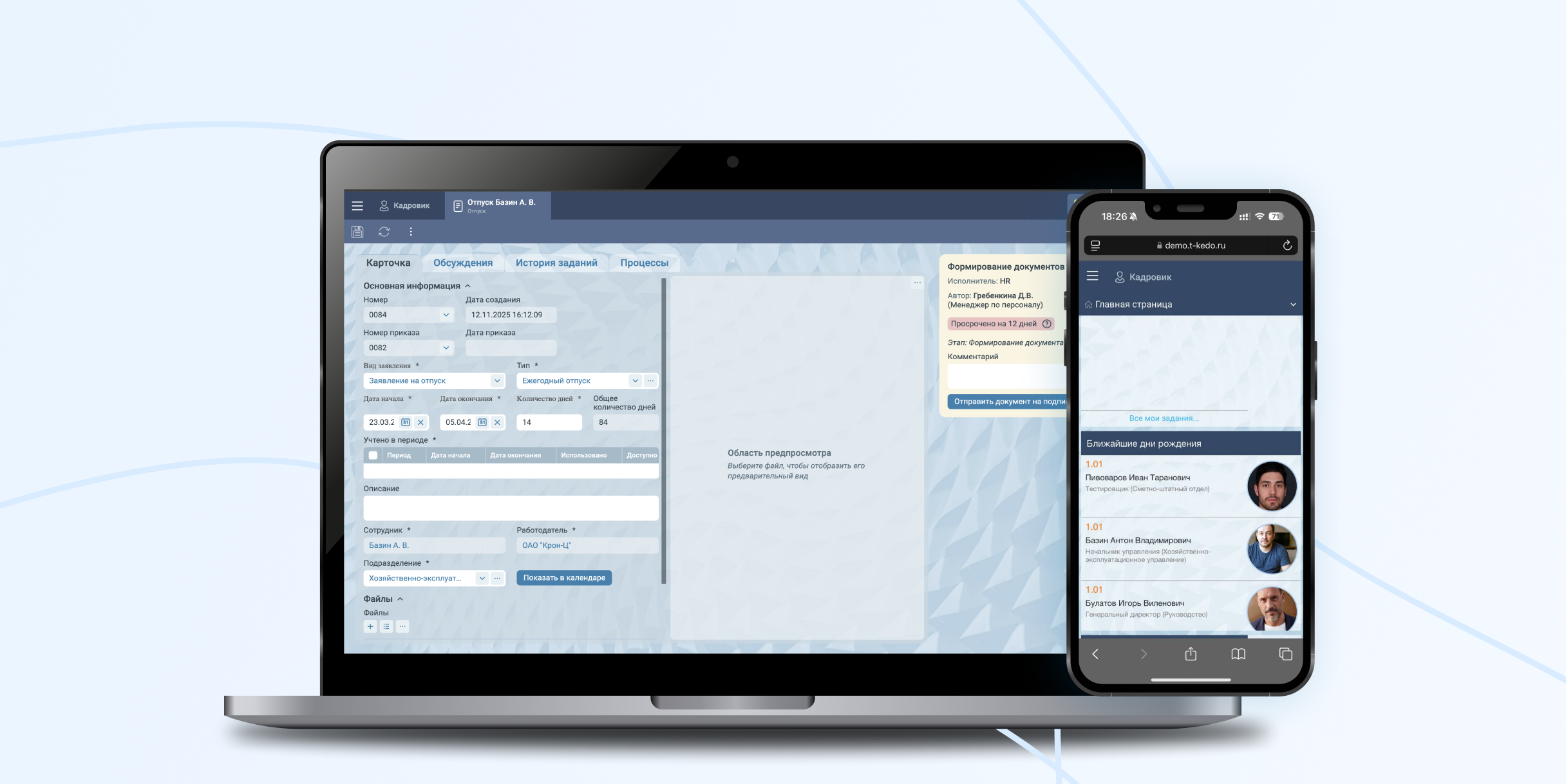 Отправка заявлений на отпуск (плановый или внеплановый), быстрое согласование и оформление приказа.