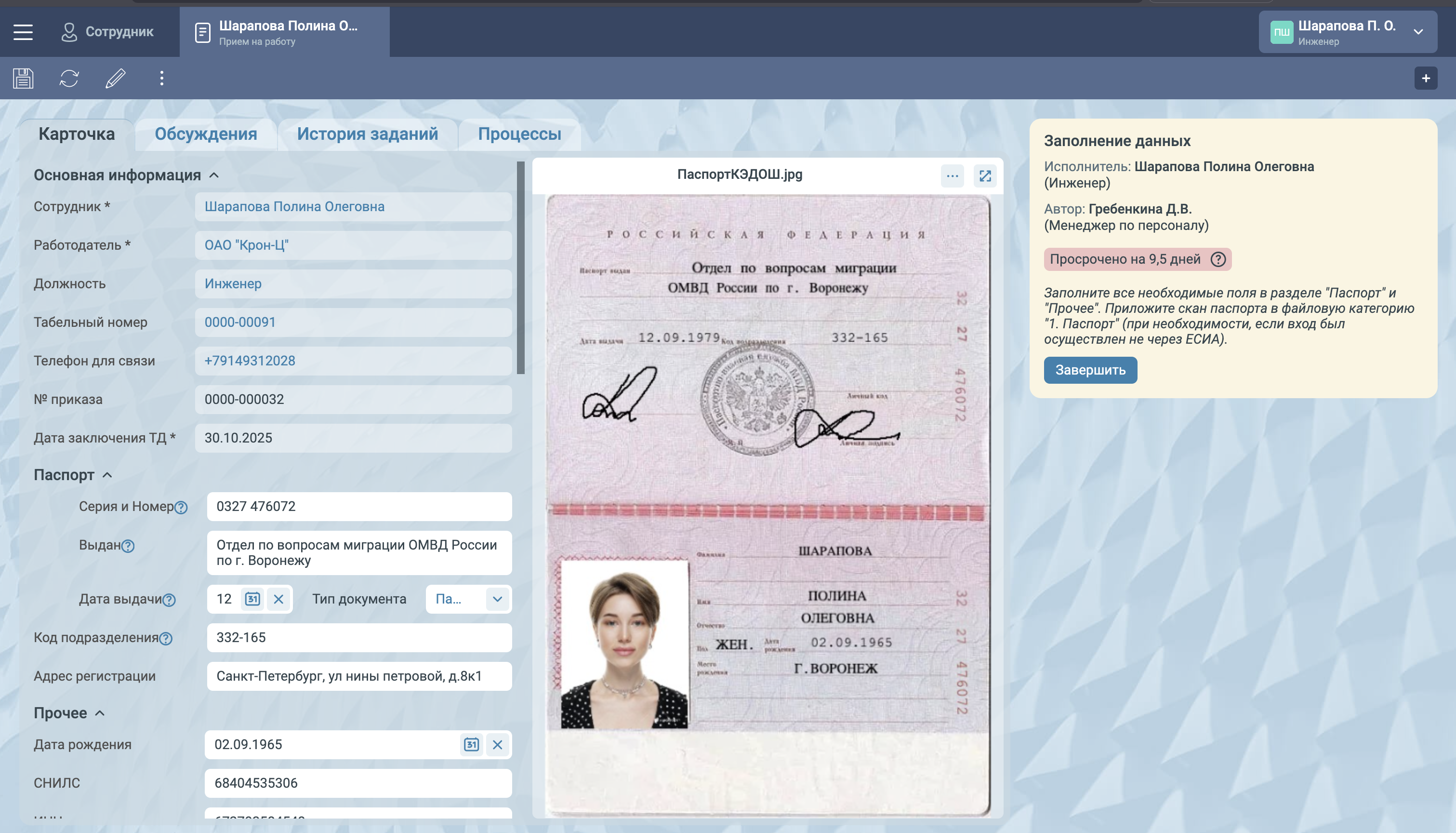 Сотрудник получает e-mail со ссылкой на карточку, переходит в нее, заполняет данные и прикрепляет сканы. Если открыть систему на мобильном телефоне, то доступна функция фотографирования.
